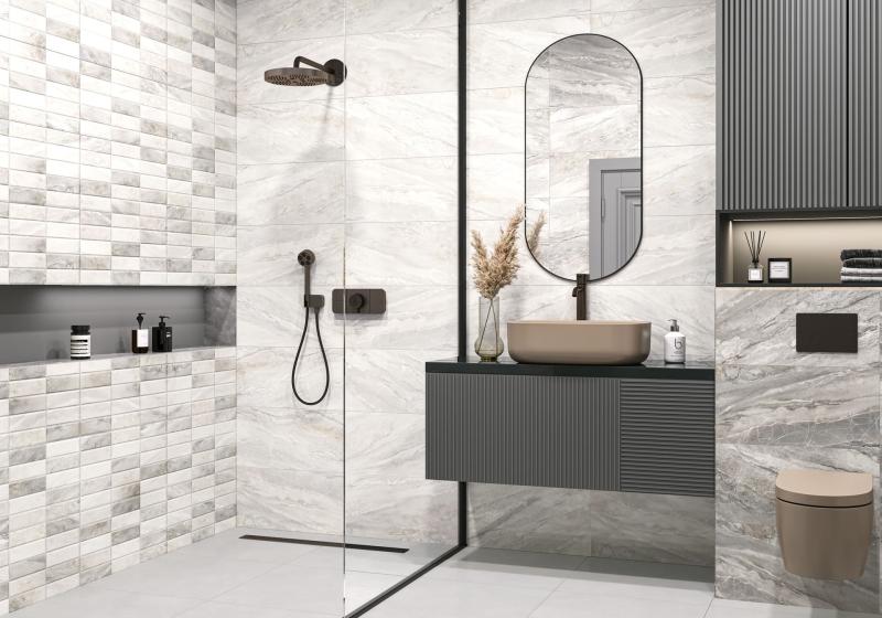 Словно море в интерьере. Две гаммы (тёплая и холодная) позволяют гибко работать с пространством. Изюминка коллекции — декор на рельефе «кирпичик» с сохранением мраморного рисунка. Создаёт потрясающий объём на акцентных стенах.