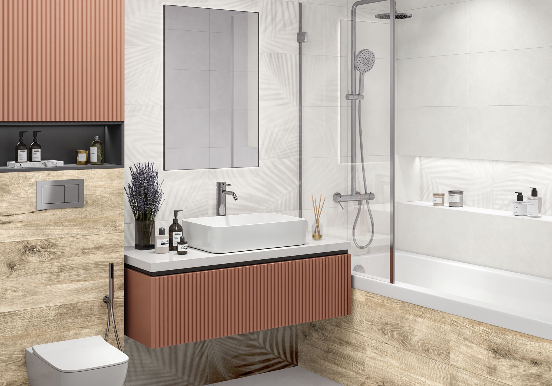 Современная классика. Урбанистический бетон + теплота древесины + эксклюзивный декор с пальмовыми листьями. Матовая поверхность очень практична в эксплуатации. Идеально для лофтов, минимализма и эко-стилей.